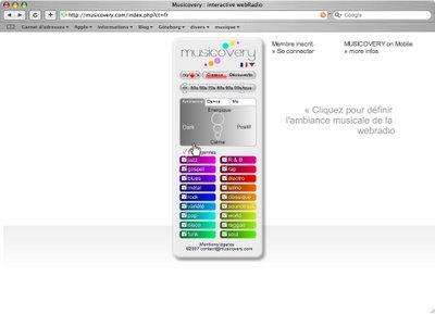 Sinon, aujourd'hui je vais vous faire découvrir un site internet génial pour les amateurs de musique que vous êtes. Son nom : Musicovery. C'est une sorte de webradio intéractive qui permet aux auditeurs de choisir le ou les styles de musique qu'ils veulent écouter. Ca ressemble à d'autres services comme Lastfm (que je vous conseille vivement si vous connaissez pas, ma page perso étant ici) mais l'interface est beaucoup plus agréable.