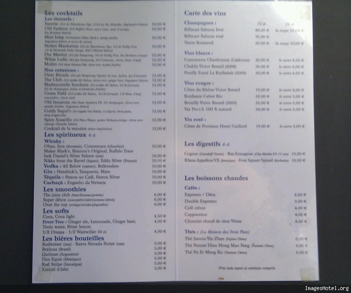 Qu'est-ce qu'on y boit ?Des cocktails : des créations mais aussi quelques traditionnels. Également des whisky, des bières en bouteille en provenance des Amériques, des vins et champagnes. Et puis quelques boissons chaudes.Voir la carte