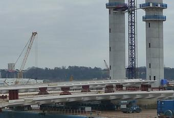 Le dimanche de la neige, une barge a apporté deux morceaux du tablier du nouveau pont bordelais, le pont Baba (et ceux qui préfèrent troquer ce nom rigolo contre celui d’un homme politique triste et mort sont priés de se taire). Mercredi dernier, jour des gosses (mais pas des travailleurs lambda, d’où mon absence), une des deux parties du tablier a été mise en place. Sa petite sœur attend sagement sur la barge, elle sera normalement installée demain (en mon absence aussi). Pour bien voir le chantier, il est conseillé de monter sur la terrasse de Cap Sciences (aux heures ad hoc) ou, plus simplement, au 2e niveau du parking H19.
