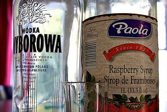 Comment faire ? Vous versez le sirop de framboises dans un petit verre à vodka, puis le long d'une petite cuillère vous versez lentement la vodka (trèèèèès froide et de bonne qualité de préférence ;-)). Si vous avez procédés avec minutie vous obtiendrez ceci:
