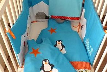 Le thème de la banquise aurait pu m'être inspiré par le froid qui a régné sur la France pendant 3 semaines, mai tel ne fut pas le cas : c'est Elodie, maman d'un petit garçon de 2 ans et future maman d'un deuxième, hésitait entre le thème de la forêt ou celui de la banquise pour un ensemble tour de lit, gigoteuse hiver et couverture bébé. Finalement, après quelques mails, elle se décida pour "le thème de la banquise : les pingouins, les ours blancs, les phoques, les esquimaux, les igloos, la glace, les icebergs... (genre un peu dessin animé)".