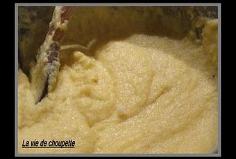 Hors du feu, incorporer les jaunes d'oeufs, la moitié du beurre, la poudre d'amandes, les blancs battus en niege.