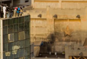 En bas, sur la place du marché Sandaga, forces de l’ordre et manifestants s’affrontent à coups de grenades lacrymo et de cailloux lors des manifestations du 17 février 2012.