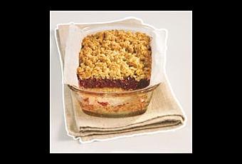 - Presser la moitié des ingrédients secs dans un petit moule recouvert d'une feuille de papier parchemin. Verser les framboises et couvrir avec les ingrédients secs restants.