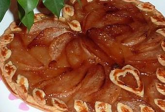 J'ai donc fait une petite tarte aux poires caramélisées, qui ceci-dit en passant, était super bonne mais que j'ai quand même fait en plus de 2 h !!! Voilà la photo de ma petite tarte intitulée : "Tendre coeur aux poires"