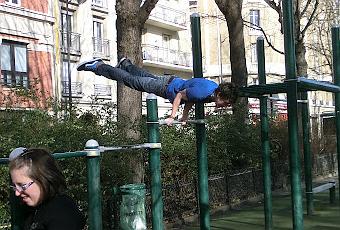 Théo - ParisPuis il a enlevé le blouson et a commencé à s'échauffer. Peu à peu les yeux se sont tournés vers lui et les cris d'admiration ont fusé après les premières acrobaties, les premières démonstrations de street workout à la barre fixe.