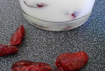 Dans chaque pot à yaourt, déposer des cranberries séchées ou abricots secs en morceaux puis verser par-dessus la préparation.
