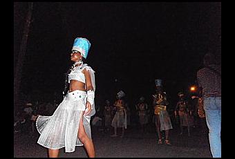 son costume est original fait de feuille de bananier .Ensuite se fut le "merdier" des temps d'attente entre chaque groupe qui faisait que les gens se déplaçaient sur la route réservé aux