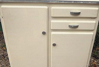 Ancien buffet de cuisine typique 50’patiné gris bleu - Intérieur peint en gris foncé