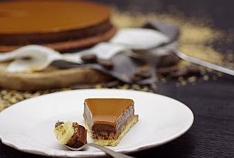 sous une fine couche de pâte sablée, un disque croustillant praliné recouvert d'un crémeux bien tendre au chocolat et le tout surmonté d'un topping généreux en caramel!!!! le rêve quoi...