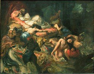 Avant d'être poète, Baudelaire a testé sa plume comme critique d'art. Maniant le stylet de façon plus ou moins acerbe, il donne des compte-rendus des Salons et des ventes pour améliorer son ordinaire. Si ses premiers écrits sont très scolaires (Baudelaire commente tous les peintres et tableaux qui retiennent son attention), notre poète élabore ensuite une véritable pensée critique sur ce qui fait la valeur de l'art. Fasciné par Delacroix et les Romantiques (dont je vous présente la belle esquisse du Sardanapale, moins connue que le tableau mais si belle), sévère avec Ingres, ami de Courbet et des Impressionnistes, Baudelaire prône un art qui puise à l'imaginaire. Comme en littérature, il choisit la sensation, l'étonnement pour déterminer le poids d'une peinture et son retentissement. Un recueil assez vaste de textes et d'articles qui manque un peu d'illustrations (si beaucoup des tableaux évoqués sont célèbres, d'autres sont totalement oubliés). Idéal pour saisir les grands débats artistiques du XIXe siècle et l'élaboration du concept de "beauté" pour ce cher Charles !