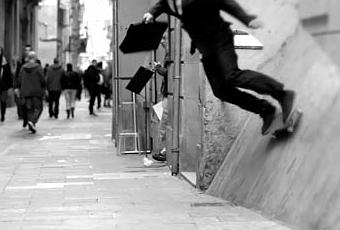 Le déplacement quotidien en skate version costard-cravatte , déjà ça envoie ! Mais en noir et blanc sur un grand classique du jazz, c’est l’édit super classe du jour !!