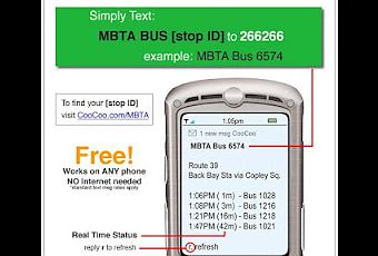 Sur la page d'accueil du site, www.mbta.com, la solution SMS+ CooCoo est mise en avant (pub ci-contre) depuis le 2/2/2012. "Works on ANY phone, NO internet needed". Cette solution est classique et utile; vous envoyez le code arrêt par SMS et vous recevez les prochains passages à cet arrêt par SMS également.MBTA offre également une très belle version Internet mobile de son site présentant les horaires temps réel, les perturbations, l'accès à un calculateur d'itinéraires, et diverses informations.