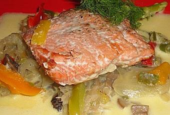 Salez légèrement, poivrez les pavés de saumons et déposez dans un plat beurré avec le poivron émincé.