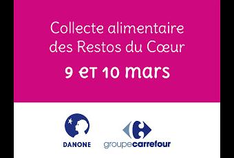 Les 9 et 10 mars prochains, les magasins Carrefour, accompagnés de Danone, lancent leur collecte annuelle pour les Restos du Coeur. Pensez à apporter votre contribution après votre passage à la caisse. Un petit rien peut devenir beaucoup si on s’y met tous !