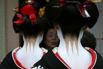 Les cheveux, relevés à la mode des jeunes maikos (wareshinobu), mettente en valeur la nuque fine, peinte en blanc et exposant l'une des zones de peau les plus érotiques au Japon...