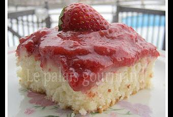 Tamiser ensemble la farine et la poudre à pâte. Mettre de côté. Dans un bol, défaire le beurre en crème et incorporer graduellement le sucre jusqu'à consistance onctueuse. Verser le quart du lait et de la farine. Mélanger. Répéter jusqu'à épuisement du lait et de la farine. Beurrer un moule carré de 8po (20 cm) à haut rebord ou un 9 pouces. Verser la pâte et réserver. Verser la sauce aux fraises sur la pâte à gâteau en s'aidant d'une cuillère à soupe si nécessaire (il ne faut pas que la sauce se mélange à la pâte). Cuire 45 minutes à 1 heure et surveiller la cuisson du milieu du pouding.