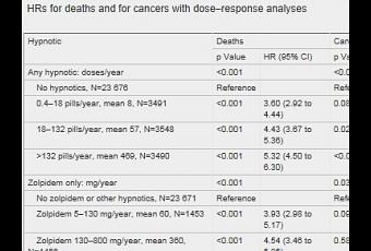 Un risque avéré à partir de 18 prises par an : Les 10.531 participants à l'étude, âgés de 18 ans et plus, usagers de somnifères ont été appariés avec 23.674 patients témoins du même âge, sexe et état de santé qui ne prenaient aucun hypnotique. Même chez les patients qui ont pris 1 à 18 somnifères par an, le risque de décès s'avère 3,6 fois plus élevé que chez les participants qui n'en prenaient pas. Et le risque concerne tous les groupes d'âge.