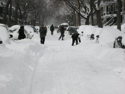 À Montréal, j'ai l'habitude de ne pas connaître mes voisins. C'est comme ça, ce n'est pas parce que je ne suis pas sociable. Bien sûr, j'échange avec ma voisine l'été au-dessus de la clôture sur les choses pratico-pratiques qui concernent des propriétaires, mais on ne s'invite pas pour un café.Comme vous y avez tous goûté, ce week-end la neige en a incommodé plus d'un. Je vous montre une photo de notre rue, prise dimanche matin par mon homme chat après qu'il eut pelleté un 2e jour pour enlever 40 cm de neige sur l'auto et plusieurs dizaines de kilos autour.