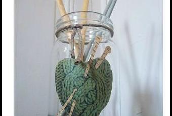 * Un pot ancien en verre * Une image de mailles tricotées * 2 Pages de vieux livre * Une paire de ciseaux * Une règle * Un crayon à papier HB * Du vernis colle * Un moreau de ficelle de chanvre