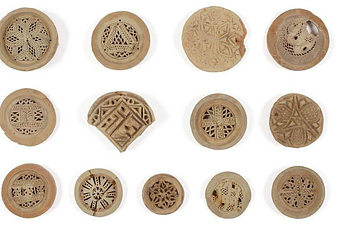 PHILTRES DE GARGOULETTES ET MATRICES, PROCHE-ORIENT, XIIe-XIIIe SIÈCLE Dix philtres de gargoulettes en céramique argileuse à décor ajouré de motifs cruciforme, étoilé, rosace, éléphant et lettres épigraphiées; trois matrices à décor estampé de motifs géométriques et épigraphie. Diam.: entre 5 et 8 cm Provenance: collection de M. J.-P.C, Genève