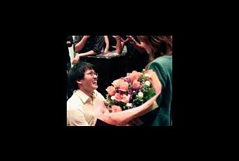 Le blogueur Timothy Tiah Ewe Tiam fait sa demande en mariage à la blogueuse Audrey Ooi Feng Ling dans un restaurant avec des images de meme.