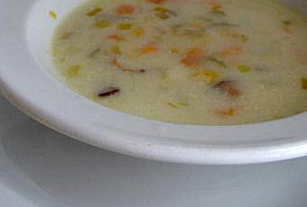 Couper tous les légumes en petits cubes. Faire cuire le bacon à feu moyen dans une casserole jusqu'à ce qu'il soit cuit. Ajouter une cuillère à soupe d'huile. Ajouter l'échalote, le poireau, le céleri et laisser revenir environ 5 min à feu doux. Ajouter la pomme de terre, la patate douce et le maïs et laisser cuire encore 5 min en remuant de temps en temps. Ajouter le vin blanc, le bouillon, l'eau, le sel, le poivre, le piment, l'ail, le laurier et porter à ébullition. Réduire le feu et cuire de 20 à 30 min. Incorporer la crème juste au moment de servir.