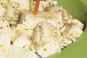 Couper les boules de mozzarella en cubes, mélanger avec le pesto et l'huile d'olive et réserver au frais... jusqu'au moment de servir....