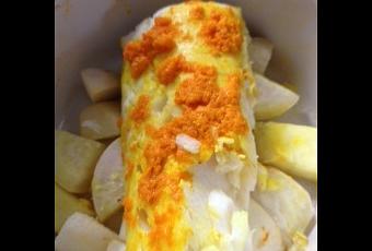 Mélanger 1 c. à soupe d’huile d’olive + 1 petite racine de curcuma rapé + jus d’1/2 citron et étaler sur le poisson (même l’avance)