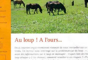 Dans le n°44 de "Randonner à cheval", Pierre Miriski reprend dans son éditorial le courrier d'un lecteur apeuré à propos d'une éventuelle rencontre entre randonneurs et prédateurs et celui de Monsieur Savignol, éleveur de chevaux merens en Ariège, au Haras Picard du Sart. Une enquête s'impose !