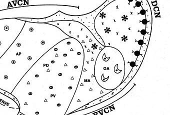 On distingue trois divisions principales: AVCN (noyau cochléaire antéroventral), PVCN (postéroventral), DCN (dorsoventral). Ces divisions sont corrélées, mais non confondues, avec les distributions de neurones de divers types. Parmi ceux-ci, il est intéressant de repérer les neurones de type “bushy” sphériques et globulaires (AVCN), toutes deux spécialisées dans la transmission d’informations temporelles fines, sans perte de résolution. Une autre cellule spécialisée pour le traitement temporel est la cellule “octopus” (PVCN).