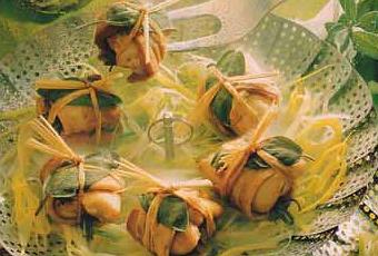 - Saupoudrez de sauge ciselée, roulez chaque morceau dans une tranche de ventrêche. ajoutez une feuille de sauge et ficelez en petits baluchons.