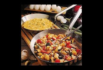 - Dans une sauteuse, chauffer à feu moyen les 3/4 de l'huile. Y faire revenir les oignons 3 mn en remuant. Ajouter poivron coupé en dés, courgette, aubergine, sel et poivre. Cuire 10 à 12 mn en remuant de temps en temps.