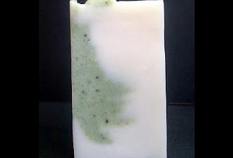 10/Dans chaque main, je prends un bol. A gauche la pâte blanche, à droite la pâte verte. Et je les verse en même temps sans bouger les bols. Ainsi les deux côtés ont une couleur différente et se mélange (au gré du hasard) au coeur du savon.