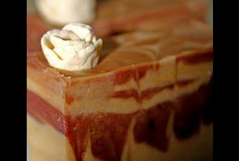 Verser le reste de pâte claire afin de faire un marbrage complexe (pour la technique, cliquer ici).Enfoncer les roses dans la pâte à savon, au gré de vos envies.