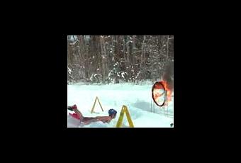 Sauter dans un cerceau en feu allongé sur un tapis en glissant sur la neige.