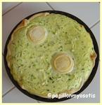 4° Versez le tout sur la pâte brisée. Coupez le second crottin en deux et enfoncez-le dans la quiche.