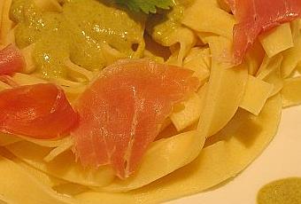 Alors cette fois-ci se sera tagliatelles fraîches avec une sauce au poivron vert et parmesan avec une effilochade de jambon cru.