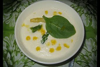 *Décorer la panna cotta de morceaux d'asperges, d'un trait de sirop d'orange et d'une feuille de pousse d'épinard