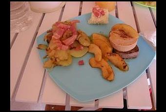 Dans une poêle faite sauter a feu vif les pommes épluchées et coupées en lamelles rajouter le sucre 5mn après rajouter l'eau bien surveiller la cuisson et réserver sur une assiette, dans la même poêle mettre les tournedos les faire cuire de chaque coté (le centre doit rester rouge) puis ajouter une tranche de foie gras baisser le veux couvrir et laisser 2 3 min cuire. Dans une poêle mettre les oignons a cuire dans un peu d'huile d'olive rajouter les pommes de terre et laisser cuire jusqu'a ce que se soit cuit.