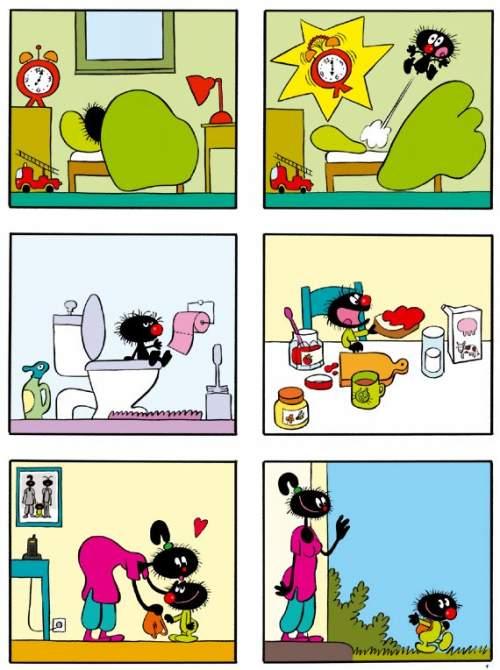 Très colorée, avec des images très sympas, cette petite bande dessinée est construite toujours sur le même modèle : Petit poilu se lève, prend son petit déj, embrasse sa maman et part pour l'école.