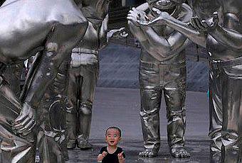 Photo : Le monde satirique d’Yua Minjun en 3D : Eh Petit! Rira bien qui rira le dernier.