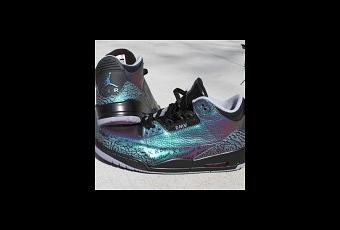 El Cappy et Kickkspott se sont associés pour customiser la Air Jordan 3 en version ‘Chamo’. La paire nous rappelle les Nike Zoom Kobe VII ‘Invisibility Cloak’ avec son dessus à reflets violet-vert.