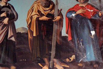 Le premier, c'est saint Pierre. Pêcheur de son état, il se nommait Simon mais le Christ lui a donné le nouveau nom de Pierre. Le second saint se nomme Simon, c'est l'un des douze apôtres. Avec son frère Jude il évangélise l'Egypte et la Perse mais, comme nous l'avons dit, il ne périt pas par la scie et n'exerce pas un métier en rapport avec le cuir.