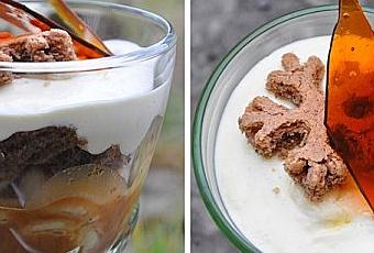 - Montage des verrines: Verser 3 cuillères à soupe environ de sauce toffee dans le fond des verrines puis répartir les rondelles de bananes. Déposer quelques cubes de moelleux au noix puis la crème au mascarpone.