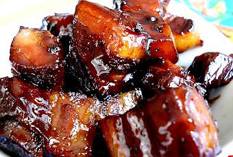 "Hong shao" est un mode de cuisson chinois pour cuire lentement la viande avec la sauce de soja noire, le but est d'avoir une sauce couleur ambrée qui enrobe bien chaque morceau de viande. Les versions de "Porc Hong Shao" se diffèrent selon les régions en Chine, avec le caramel ou sans, avec épices ou sans...