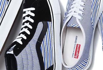 On découvre aujourd’hui les photos officielle de la nouvelle collaboration entre Supreme, Comme des Garçons SHIRT et Vans. Une paire de Sk8-Hi et une paire d’Era ont été créées à partir du tissus utilisé par la marque japonaise pour ses chemises. Elles seront disponibles à partir de mi-juin 2012.