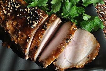 Longe de porc laqué à l'asiatiqueSource: Moi & la Cuisine, 64 recettes à petit prixPortions 4, préparation 5 minutes, cuisson 45 minutes, congélation : oui 1 gousse d'ail hachée30 ml (2 c. à soupe) de gingembre frais, râpé5 ml (1 c. à thé) d'huile de sésame125 ml (1/2 tasse) de sauce hoisin800g (1 2/3 lb) de longe de porc30 ml (2 c. à soupe) de graines de sésame 1. Préchauffer le four a 325F2. Dans un bol, mettre les 4 premiers ingrédients.3. Badigeonner la longe de porc de ce mélange, et la déposer sur une plaque à pâtisserie, tapissée de papier sulfurisé.4. Faire cuire au four 45 minutes (ou selon la cuisson désirée)5. Garnir de graines de sésame et servir Coût par portion : 2.35$
