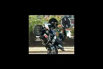 Un motard s'amuse à faire du développé couché pendant un wheeling. D'après la vidéo, il soulèverait deux poids de 45 lbs (soit 41 kg au total sans compter la barre).
