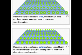 Respecter la chronologie du développement d’une théorie m’oblige à ces chemins de traverse pédagogiques . Je dois donc signaler maintenant qu’ à partir des années 1980-90 des mathématiciens et des physiciens vont « farfouiller » dans les « vieux « travaux des années 60 de l’italien GRABRIELE VENEZIANO et élargir le champ des théories des cordes ….En effet la théorie s’ouvre alors à des concepts où les cordes agissent dans des espaces à plusieurs dimensions et dépassant celles de notre monde visible ….. Cinq théories sont proposées et on s’aperçoit que la théorie-ancêtre , celle des cordes bosoniques évolue dans 26 dimensions :( Elle contient un tachyon (type de particule hypothétique dont l’énergie est une quantité réelle et la masse (au repos), un imaginaire pur), ce qui serait une indication que la dite théorie est instable, et donc impropre à décrire la simple réalité d’un univers quasi uniquement énergétique et non matériel) …. Les cinq nouvelles théories se baptisent illico- presto « supercordes » tout en se contentant de 10 dimensions d’espace et d’une dimension temporelle ….Les physiciens se grattent alors fiévreusement la tête pour imaginer une cause à cet état revendiqué par les mathématiciens et ne proposent qu’ une cause hypothétique : les 7 espaces en sus de nos 3 visibles correspondraient a des dimensions si petites d’espace qu’ elles en seraient enroulées sur elles-mêmes et la cause en serait leur caractère « fossile » hérité des conditions initiales du début ultra compact du début de l’univers ……Ces dimensions seraient nées durant l'ère de Planck. . Durant l'ère de Planck, toutes les dimensions étaient enroulées. Elles étaient prisonnières des cordes initiales . Certaines dimensions ont réussi à s'en libérer alors que les autres sont restées enroulées. Les dimensions apparentes (celles que l'on perçoit) ont donc la taille de l'univers. JE VOUS LAISSE LIBRE D'ADHERER OU NON A CETTE EXPLICATION ! voici une photo explicative